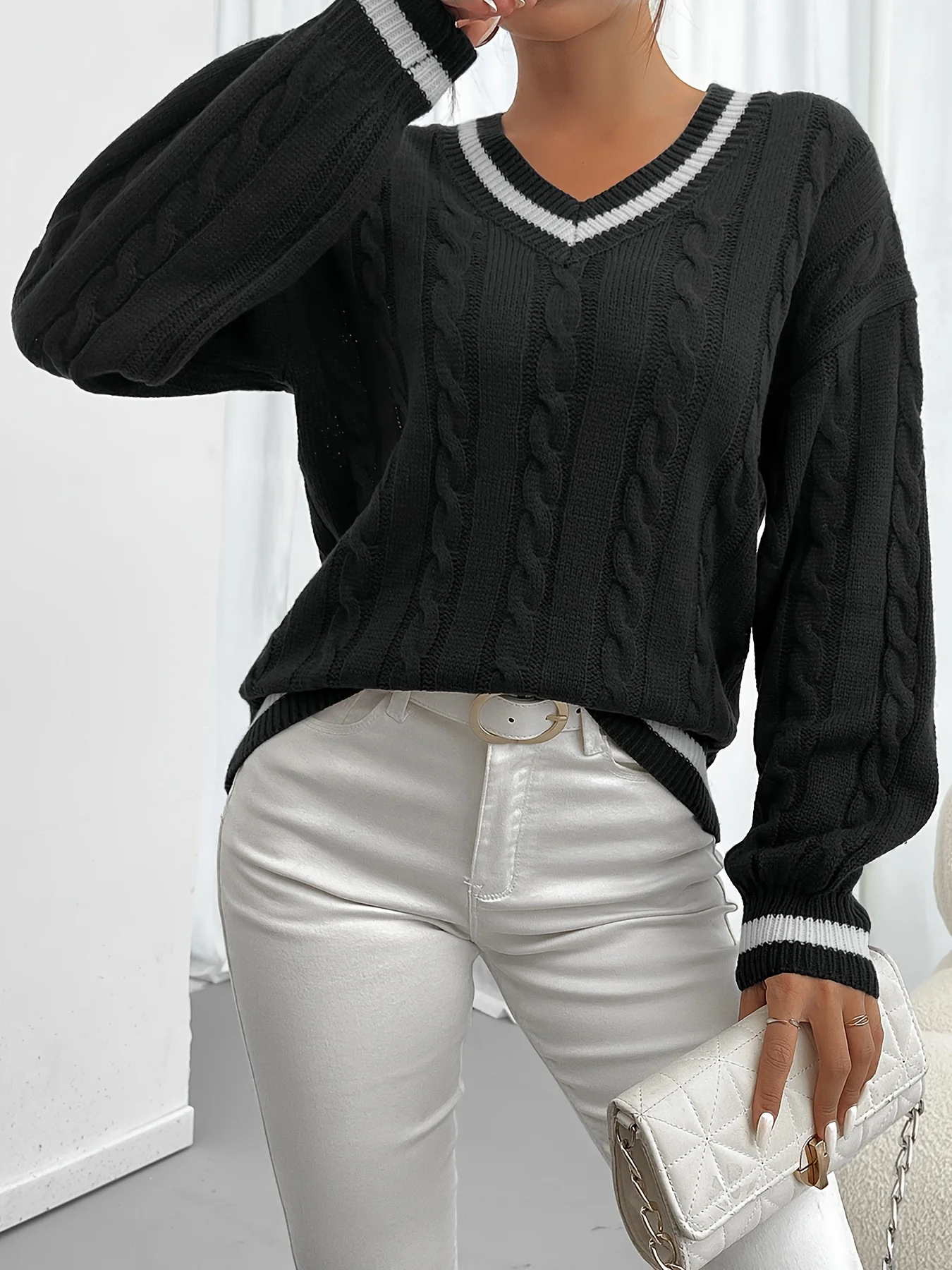 The Contrast Trim Cable Knitted Sweater is an elegant addition to your fall and winter wardrobe, offering both style and comfort. Featuring a sophisticated V-neckline and stylish lantern sleeves, this sweater showcases a beautiful cable knit design that adds texture and interest. The contrast trim details enhance its overall appeal, making it a versatile piece for various occasions. Perfect for layering or wearing on its own, this sweater pairs beautifully with skirts, jeans, or trousers.