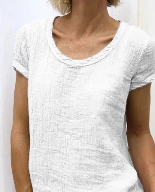 This womenās summer shirt is made from a lightweight material. It features a round neckline and short sleeves, designed for warm weather use. The plain, unpatterned fabric allows for easy pairing with casual or semi-formal outfits.