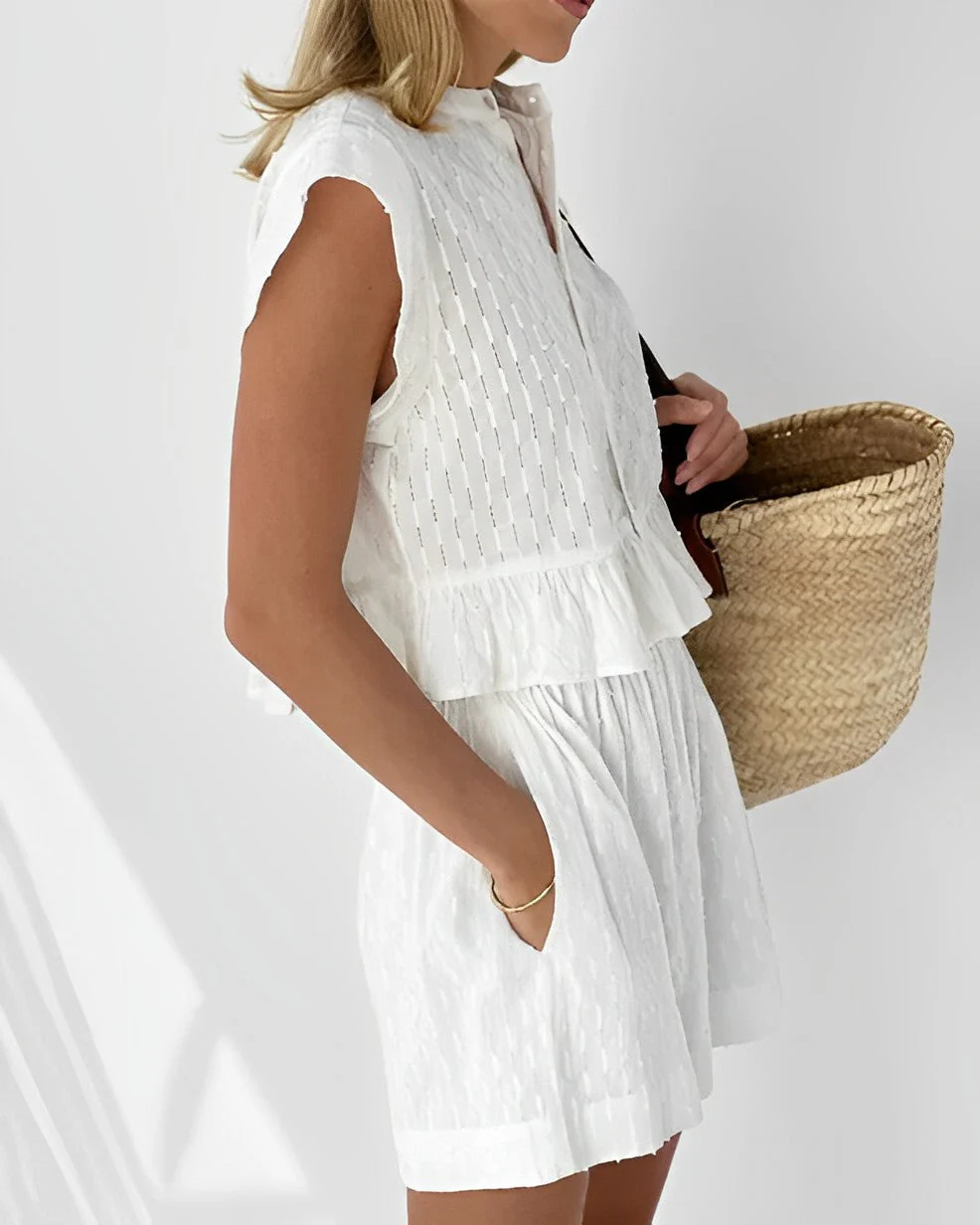 This womenās two piece summer set includes a sleeveless top with functional front buttons. The matching shorts feature an elastic waistband designed for easy pull-on wear. Both pieces are made from lightweight fabric appropriate for warm-weather conditions or summer wear. Ruffle details at the cuff and hem add structured visual interest.